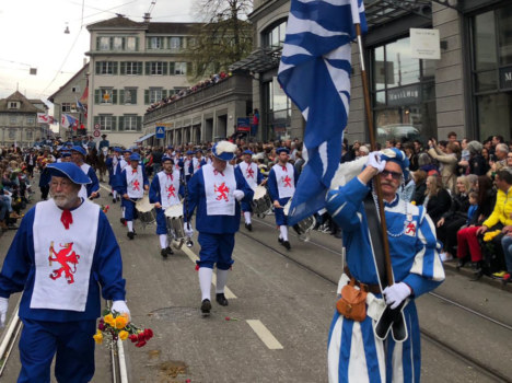 Das Spiel der Zunft zur Waag, die Polizeimusik Zürich-Stadt, sorgt für eine professionelle musikalische Umrahmung des Zugs der Zunft zum Feuer.