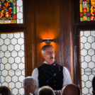 Harst der Zünfter in Biedermeierweste, blauer Schürze, Vatermörder, Masche und Zylinder.