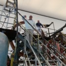 Bleicher mit der Gigampfi Wasserstampfi. Sie haben die gewebten Tücher in den «Bleichen» ausgelegt, mit Wasser gefüllt und durch Sonneneinstrahlung so hell wie möglich gebleicht. Die Gigampfi Wasserstampfi, das «allereinfältigste Wasserschöpfgerät», das es je gegeben hat, pumpt dabei das Wasser vom tieferen Seeniveau auf die höher gelegenen Bleichen.